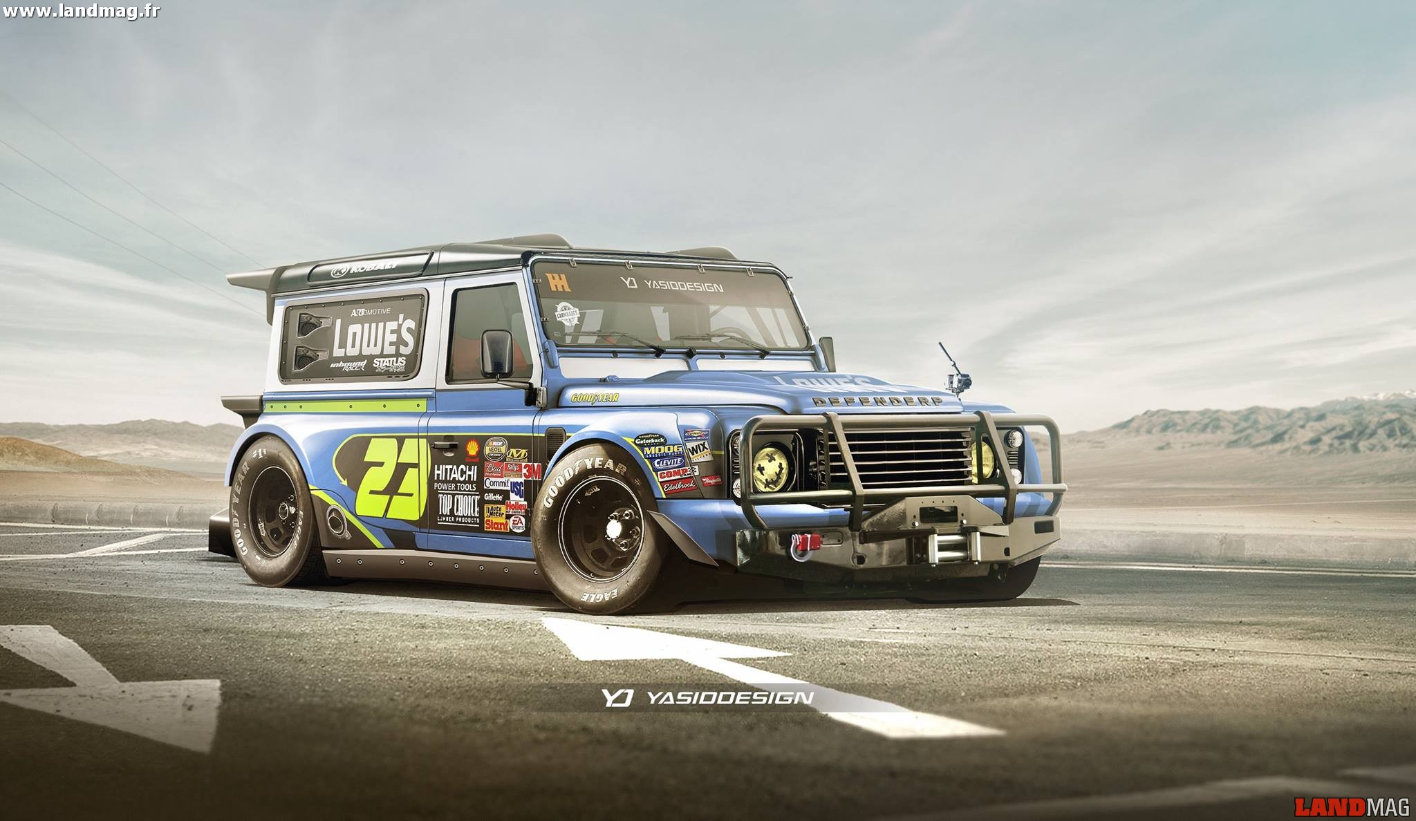 L’artiste graphiste Yasid aime l’automobile, et propose de nombreux dessins de voitures de sport sur son site personnel. Son inspiration principale reste la course et notamment la discipline du Nascar aux USA. Mais cela ne l’a pas empêché de livrer il y a quelques jours une vision très… spéciale d’un Land Rover Defender ! Rabaissé au niveau de la transmission mais aussi du toit, posé sur d’énormes jante et pneus lisse, mais doté tout de même d’un pare choc renforcé et de quoi installer un treuil, ce cube d’alu n’est certes pas réaliste mais bien sympa tout de même !