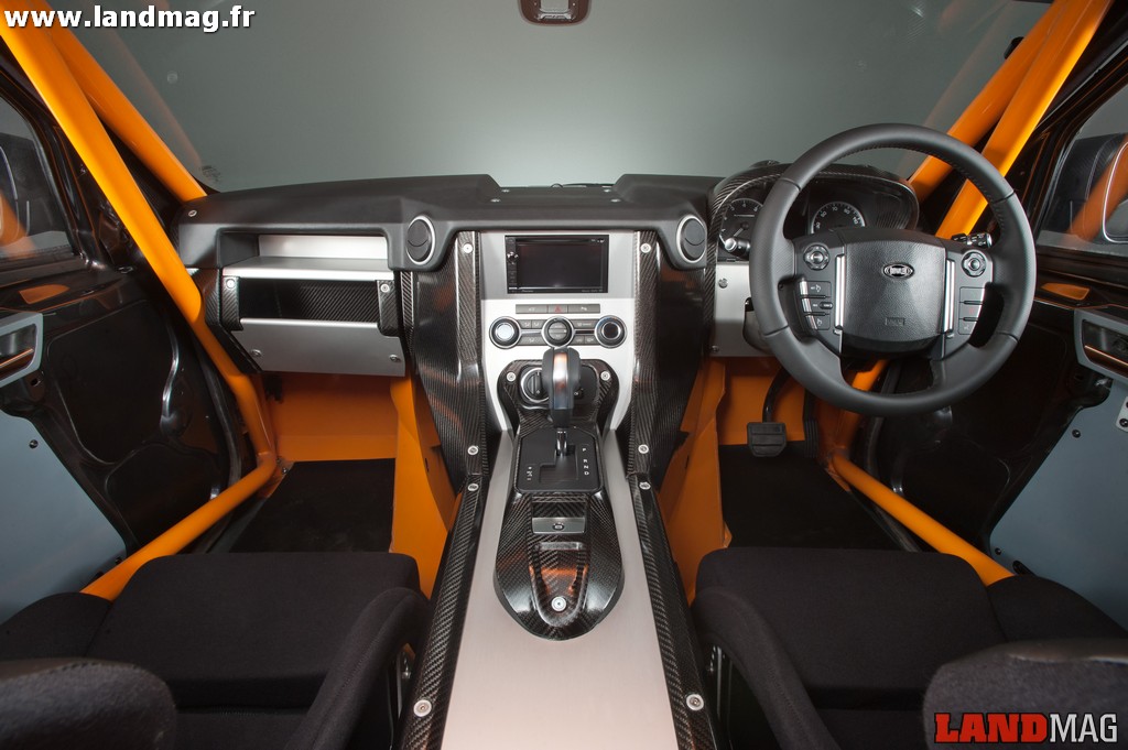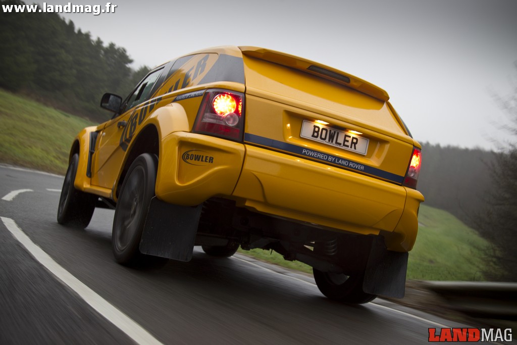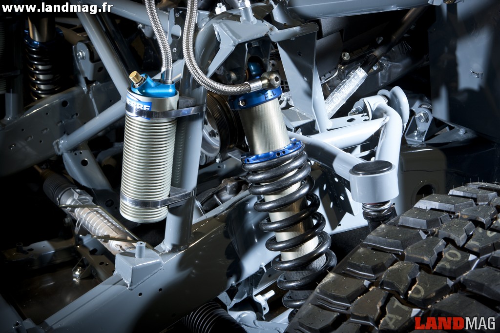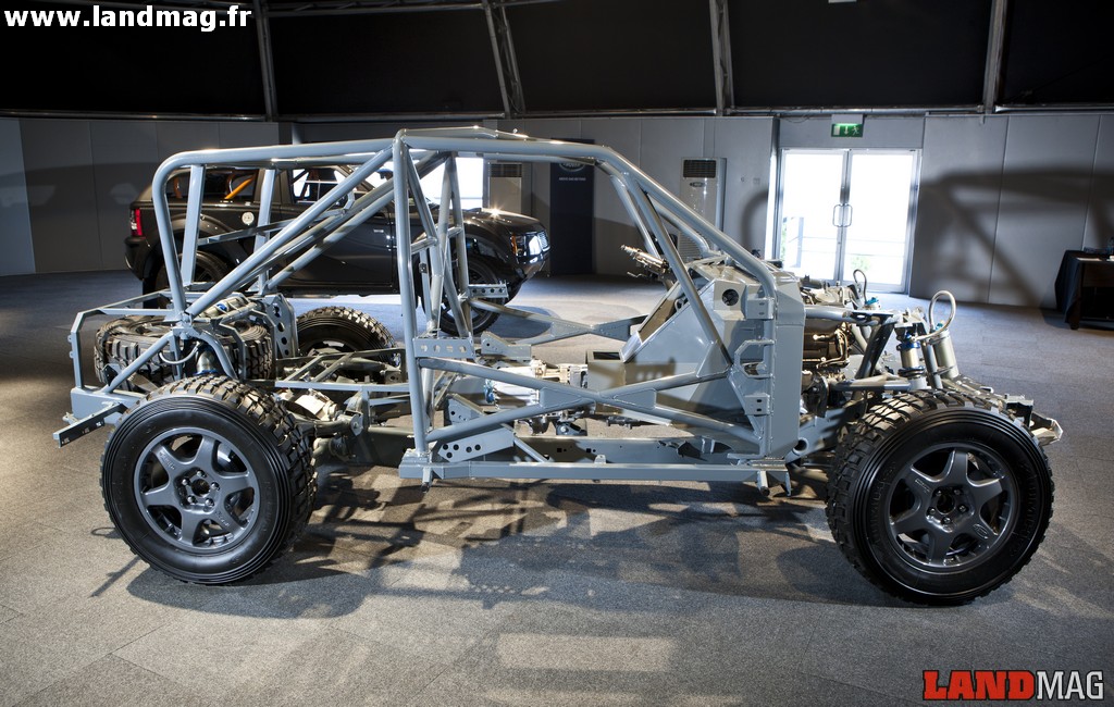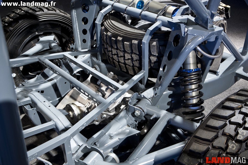 Sur le Land d’origine, il développe 510 ch. Passé entre les mains de Bowler Motorsport, il passe à 550 ch et 625 Nm de couple ! Et, sur l’ensemble de l’EXR-S, ce sont bien d’autres composants qui ont été revus de fond en comble. Le châssis est en acier hydroformé (par une très forte pression d’eau). Il se constitue d’une caisse tubulaire homologuée pour les compétitions FIA, traversée par deux poutres longitudinales. La caisse greffée sur cet ensemble métallique est en matériau composite et transforme le 4×4 familial en diabolique coupé tout terrain strict deux places. Les ailes sont démesurément accentuées pour un look toujours plus sportif et, si le bouclier arrière est similaire à celui de l’EXR de compétition, l’avant est nettement plus travaillé. Il intègre quand même un blindage central, louable précaution en cas de choc avec un obstacle naturel.