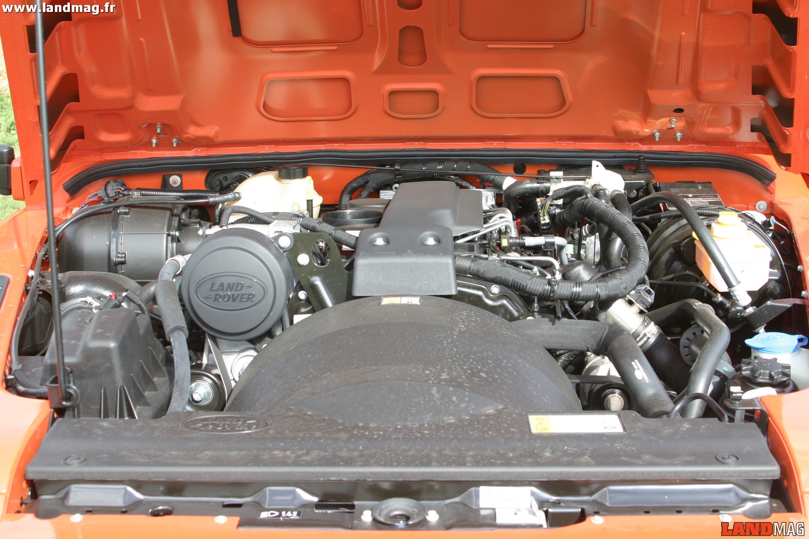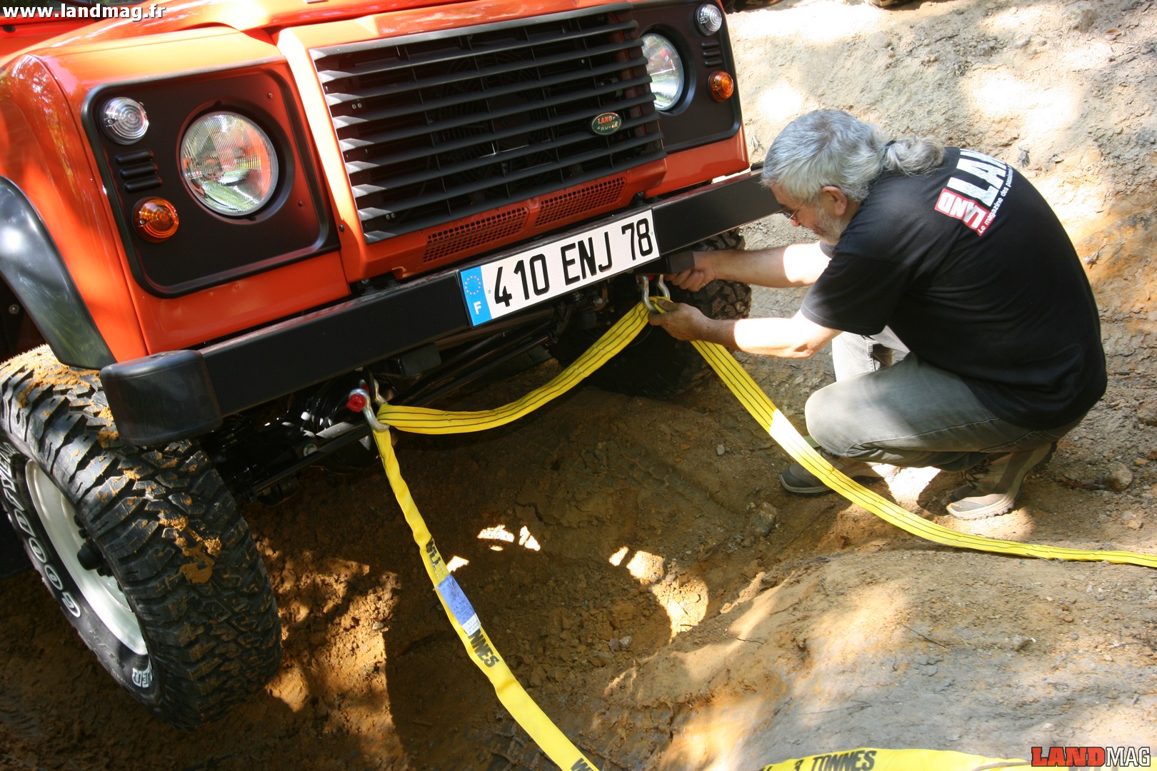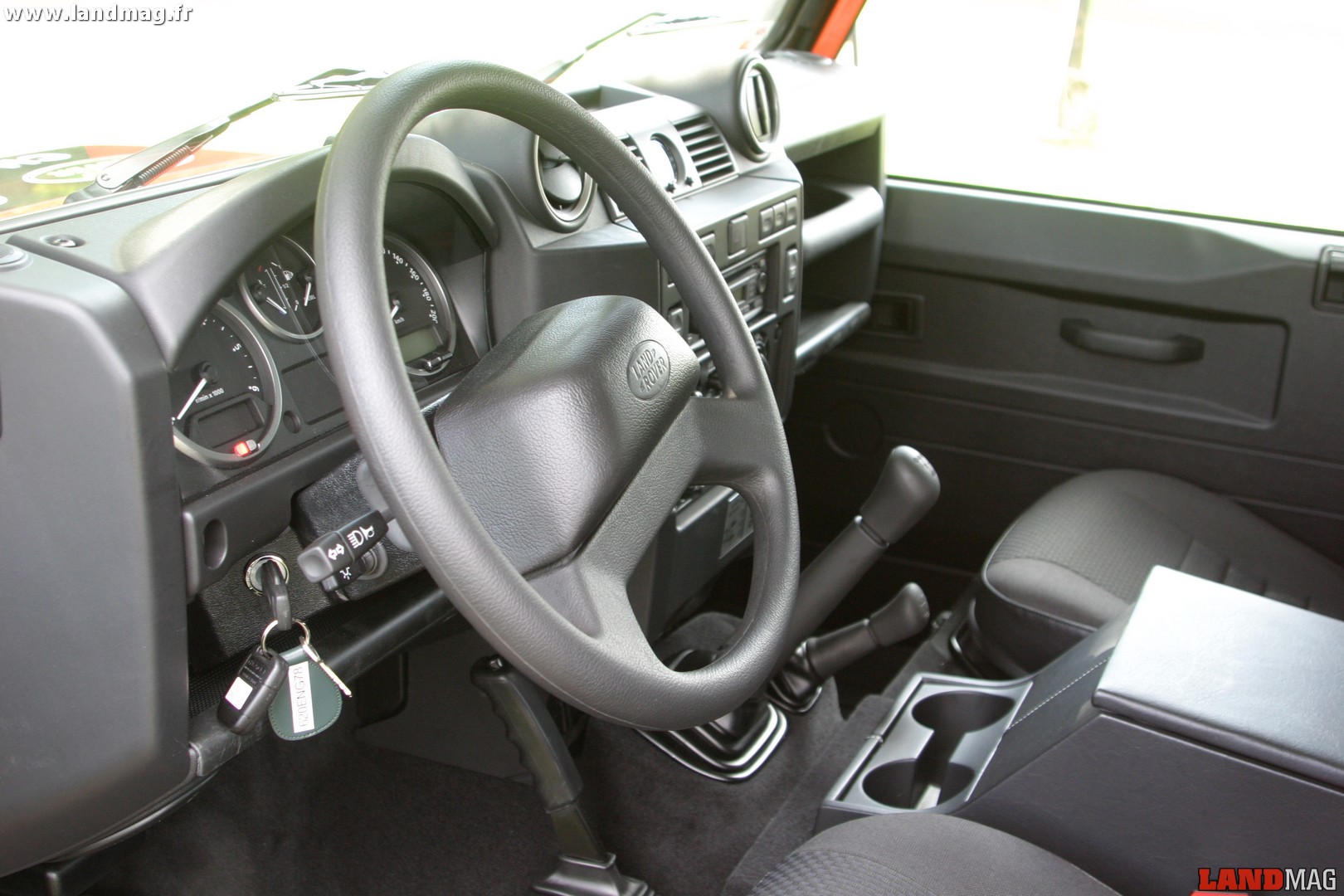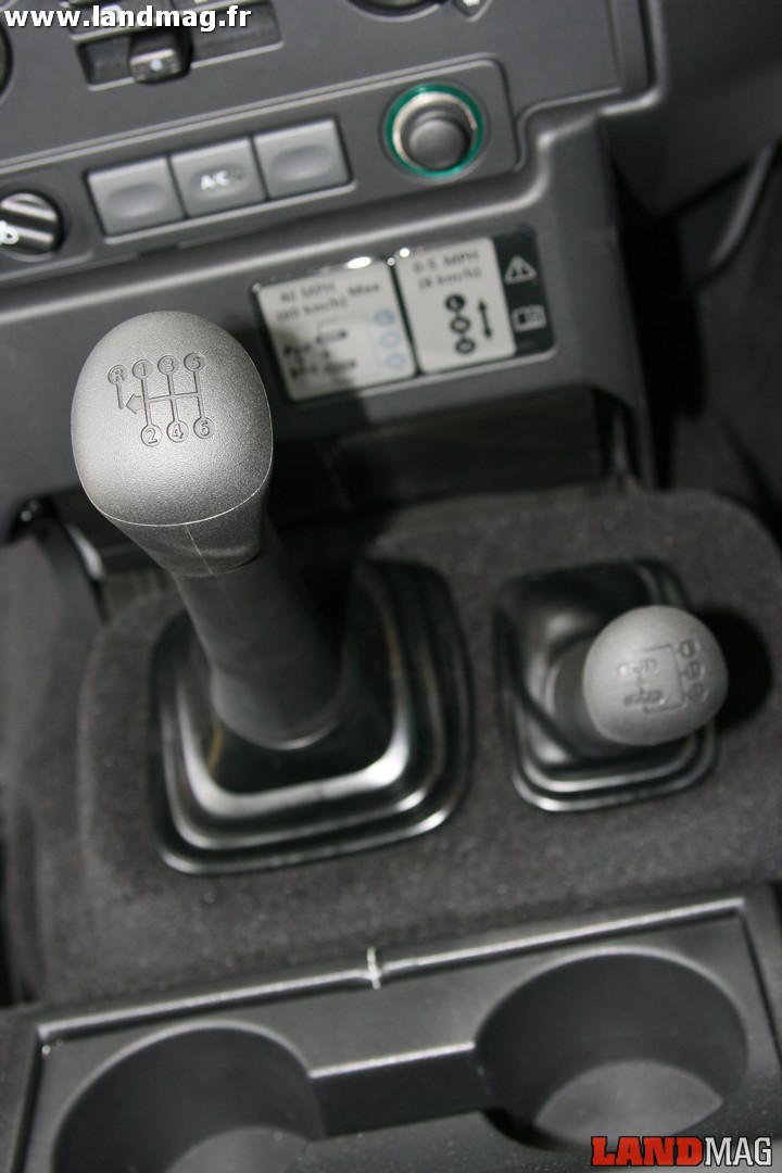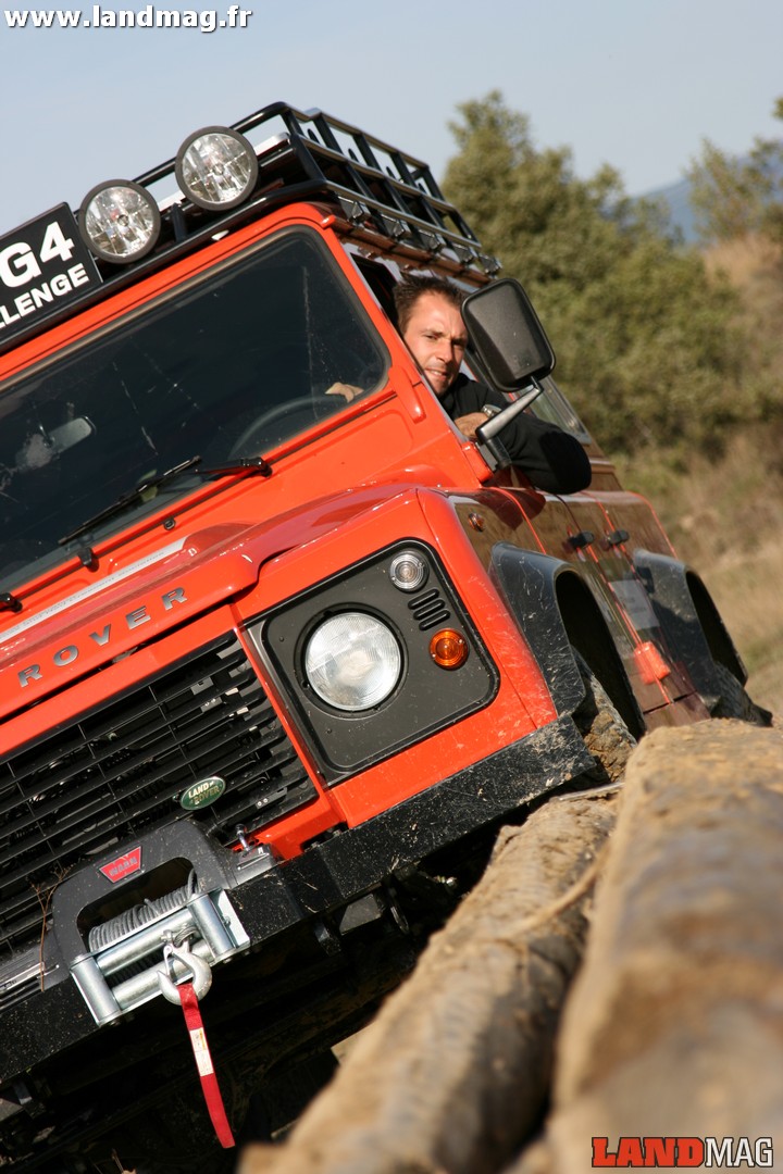 Le Defender 90 est, entre guillemets, le plus dépouillé de cette gamme de Land G4 Challenge. Par rapport à ses collègues généreusement équipés, il ne peut compter que sur sa peinture, son stickage et ses pneus Goodyear Wrangler MT/R (à surveiller sur route humide) pour évoquer la grande aventure. Mais cela lui suffit largement. On serait presque tenté de dire que cela l’avantage, car comparé aux gros 110, Discovery 3 et Range Rover Sport, le 90 fait figure de poids plume. Son châssis court lui permet de se faufiler avec adresse dans les sous-bois du Domaine du Maleyrat, lieu de nos essais et ancien site des sélections nationales du Camel Trophy. Il est également taillé pour zigzaguer avec finesse au-dessus des ornières les plus profondes. De plus, dépourvu de la galerie équipée de phares Xenon des trois autres Land, il peut voir venir les branches basses sans sourciller. Sur une zone de franchissement, il est difficile de mettre ce Land en difficulté. Doté de l’option couplée ABS-ETC, l’aide électronique à l’adhérence, le 90 ne fait que progresser, avancer, grimper sans sembler vouloir s’arrêter. Dans les fortes montées, avec son châssis court, cela en devient même presque dangereux, car le moteur 2,4 l TD est équipé d’un système anti-calage. Du coup, en première courte, on a vite fait de subir les ambitions du 4×4. Quoiqu’il en soit, avec ses quatre places assises, ce Def 90 constitue le véhicule de liaison idéal, à la fois agile et inarrêtable. Cependant, les candidats français du G4 Challenge s’en serviront pour prouver leurs compétences en mécanique.