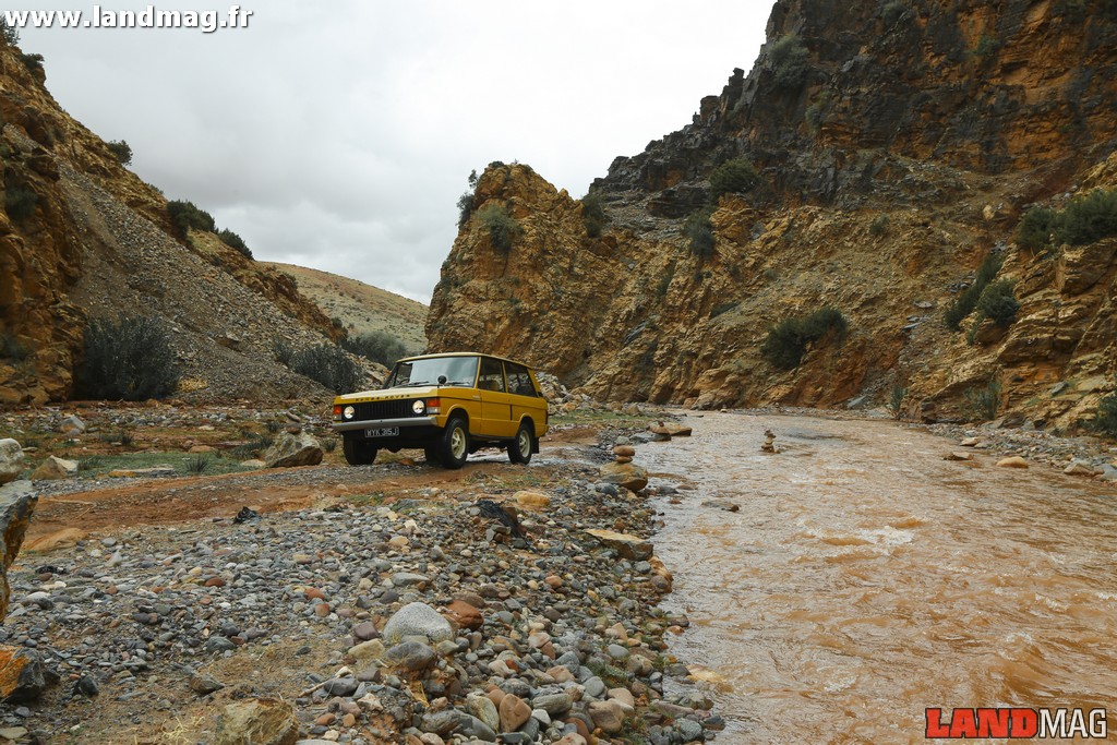 Car oui, ce « 4×4 de luxe », un concept que Land Rover invente donc avec le lancement du Range Rover en ’70, est aussi capable de crapahuter comme une chèvre dans les chemins. Ou même quand il n’y a plus de chemin, dans le lit d’une rivière par exemple, comme nous avons pu le faire en toute quiétude et en toute efficacité avec ce modèle âgé de 45 ans… Là encore, il faut réapprendre à « piloter » un véhicule 100% d’origine, c’est-à-dire sans blocages autres que le différentiel central, des amortisseur Land Rover, des pneus « à l’ancienne », un volant de la taille d’un cerceau et pas d’assistance de direction. Donc en gros juste le « diff lock » et la boîte courte, ce qui grâce aux excellents débattements du Range et au couple du V8 permet de passer en souplesse, à condition de se rappeler que le porte-à-faux arrière est, disons, imposant.