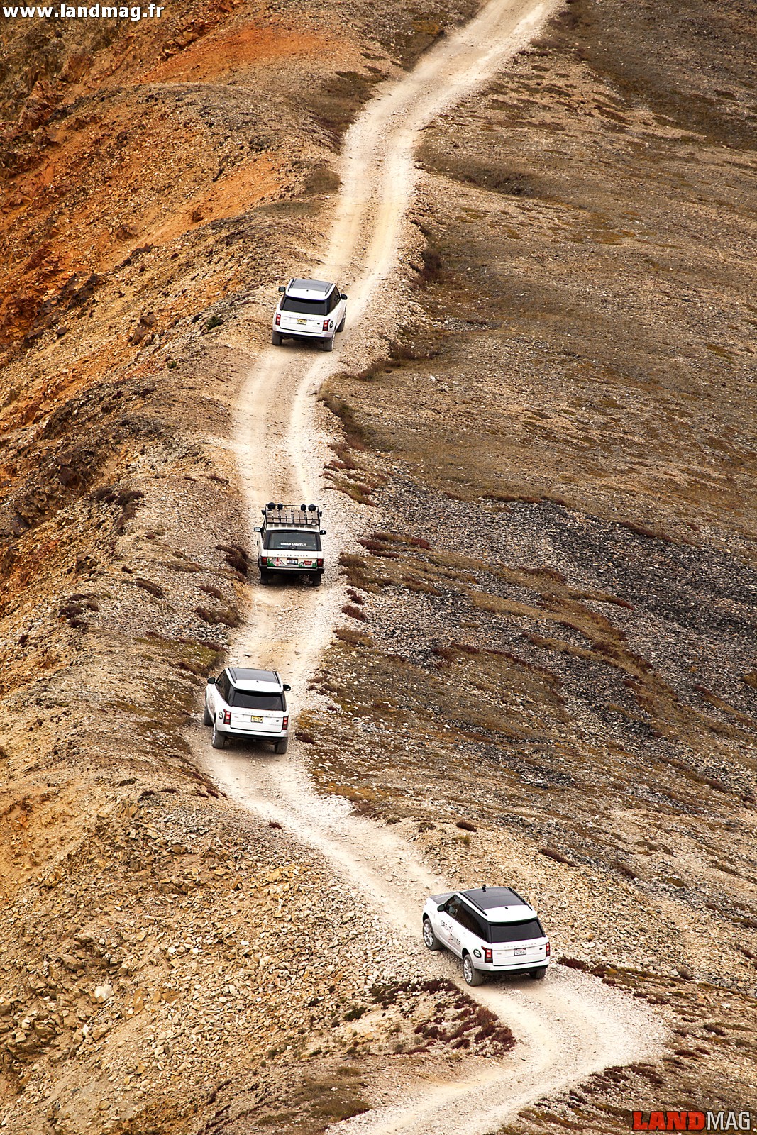 Rentrez ces données sur votre GPS et il vous indiquera un trajet d’environ 900 km, réalisable en un peu moins de 15 heures par la route. Mais ce kilométrage se trouve doublé dès qu’il s’agit de faire le trajet par les pistes. Sitôt sorti de la ville, les 10 Range sont d’ailleurs immédiatement entré dans le vif du sujet en s’attaquant au Red Cone Pass, un col situé à 3 900 m d’altitude qu’une piste rocailleuse flanquée de ravins de plus de 300 m permet de franchir. Le guide américain Dangerous Roads le déconseille aux 4×4 d’origine et aux pilotes débutants… Le convoi est pourtant passé grâce aux conseils des moniteurs du Land Rover Experience et… aux capacités toujours étonnantes des Range L405.