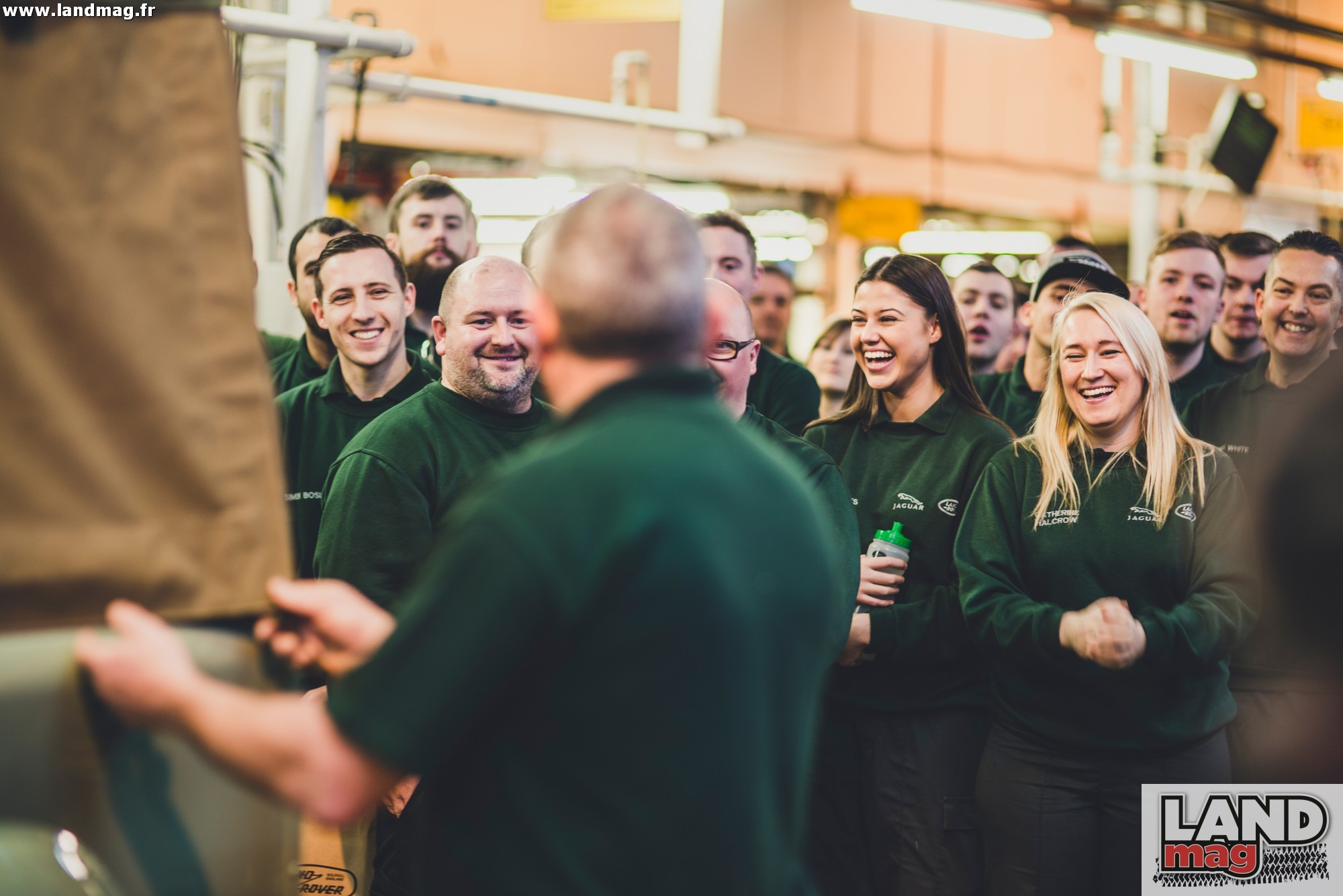 Traçant un parallèle direct avec HUE 166, la première Land jamais fabriquée 68 ans auparavant au même endroit, il s’agissait d’un modèle à empattement court et carrosserie Soft Top, peint de couleur vert pastel. Land Rover a même poussé le détail jusqu’à lui trouver auprès de l’administration britannique une plaque d’immatriculation ad hoc : H166HUE. Dans la matinée du vendredi, de nombreuses photos prises par les ouvriers et les invités présents autour de la chaîne de montage ont inondé Internet, tandis que de nombreux particuliers, clubs ou professionnels rendaient hommage à leur façon en publiant des photos de « leur » Defender en voyage, au travail ou à l’atelier.