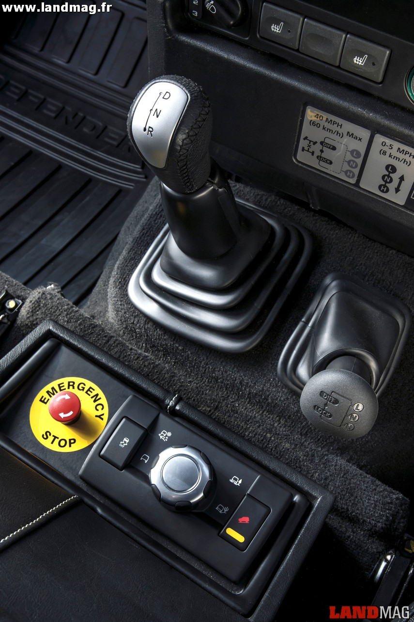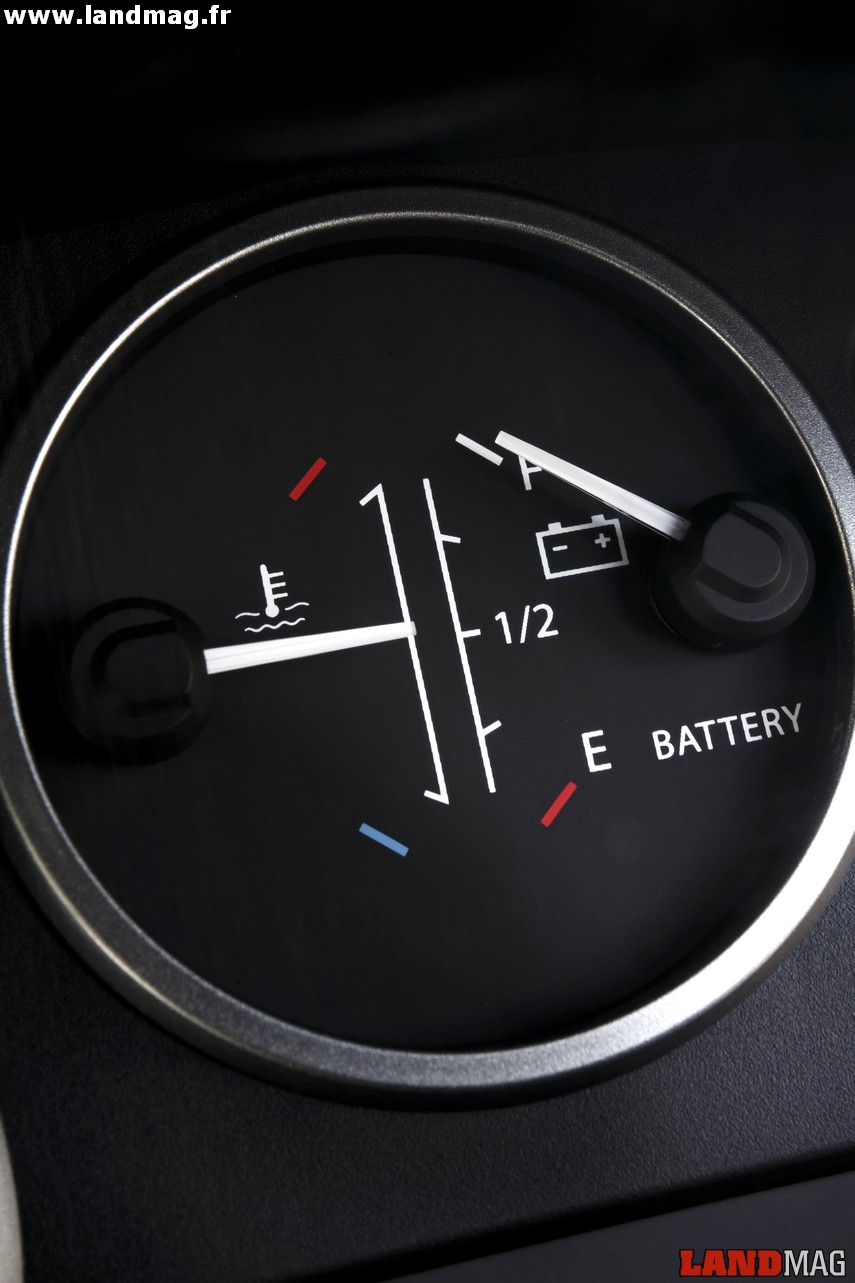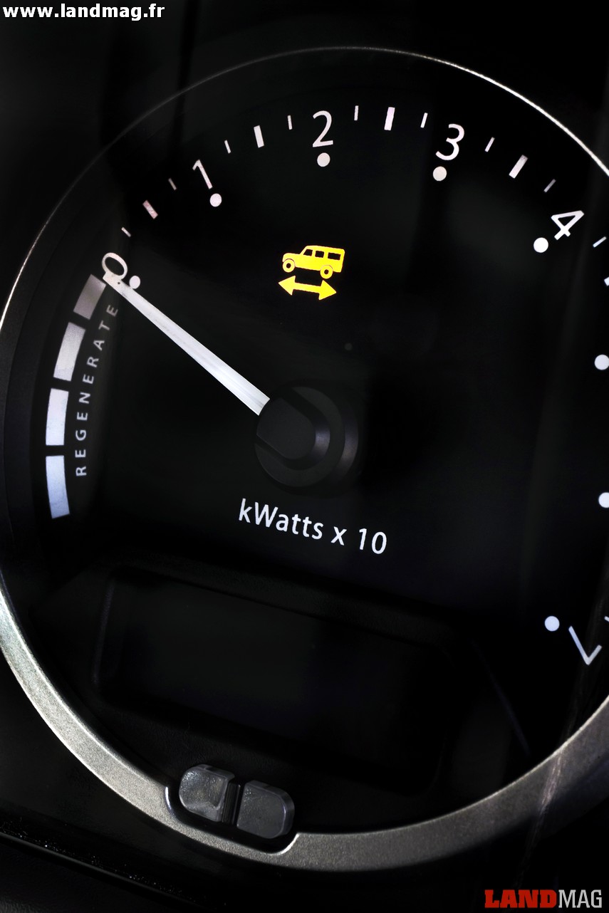 Comme toutes les voitures hybrides ou 100% électriques, ces Def disposent d’un système de récupération d’énergie au freinage, ce qui présente tout son intérêt en tout terrain, où la pédale du milieu sert très fréquemment. En effet, des maigres 80 km d’autonomie théorique annoncés, on se retrouve avec une autonomie maximale de 8 heures en situation de franchissement. Nous ne sommes malheureusement pas restés assez longtemps dans la Jungle Track pour confirmer cette estimation, mais aucun des trois Def n’a en tout cas eu besoin de sa prise de courant pendant notre passage.