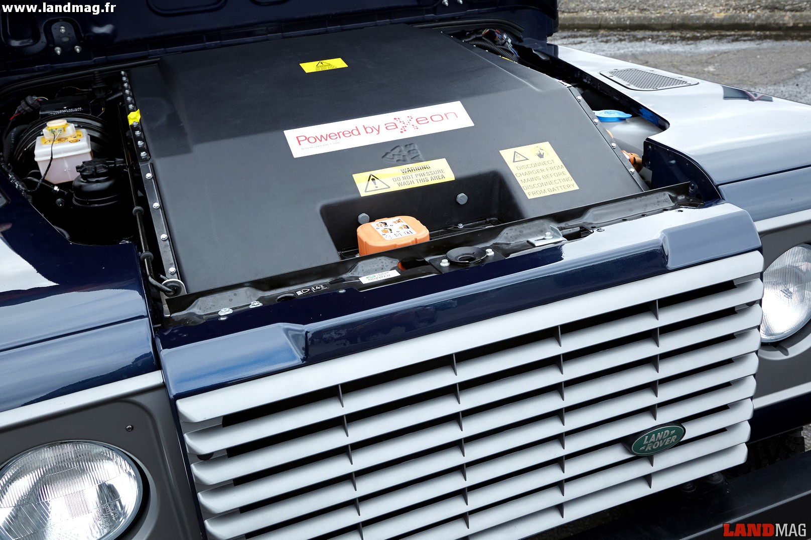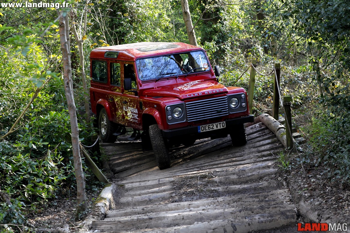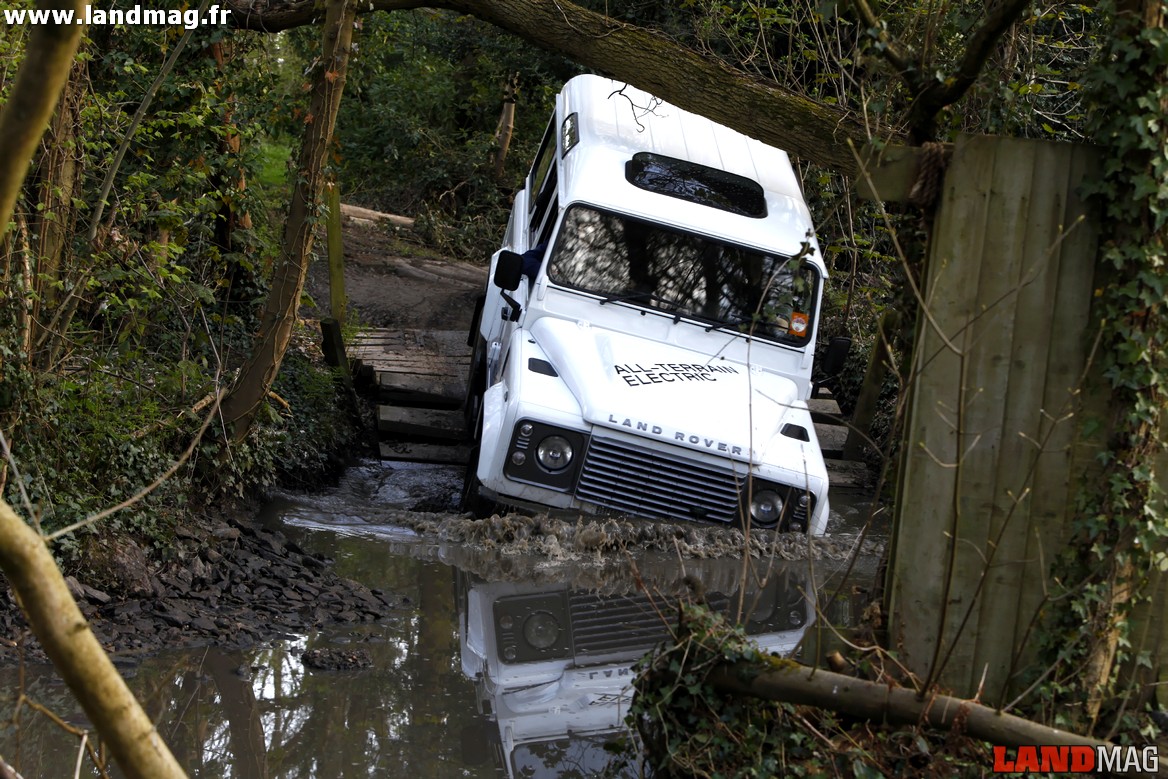 Sur le parcours cahoteux et étriqué de la Jungle Track, qui comporte son lot de petites montées et descentes raides, de dénivelés et de croisements de pont créés artificiellement, le tout électrique s’apprécie grandement : il n’y a plus qu’à penser à la trajectoire et au dosage de l’accélération, nettement plus fin qu’avec un moteur thermique. Aucune crainte à avoir pour ce qui est des passages à gué avec ce moteur électrique, conçu par les Anglais d’Axeon. Ses batteries au Lithium-Ion et toute la connectique sont parfaitement isolées dans le lourd caisson (environ 100 kg) qui remplace purement et simplement l’habituel bloc 2,2 l TD.