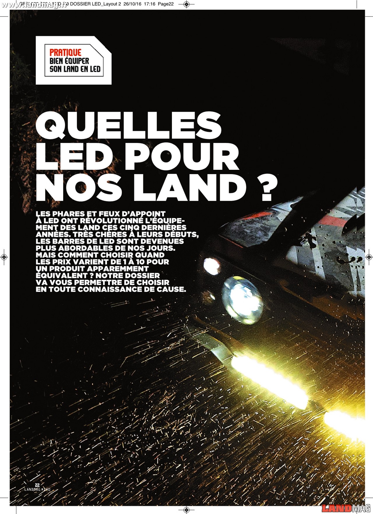 Il faut dire que leur efficacité est diabolique, avec en plus un faible consommation qui soulage le faisceau électrique du véhicule, et des formats variés qui permettent de les intégrer à tout type de prépa. Mais comment choisir quand les prix varient de 1 à 10 pour un produit apparemment équivalent ? Notre dossier à retrouver dans Land Mag 140 actuellement en kiosques va vous permettre de choisir en toute connaissance de cause.