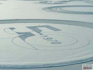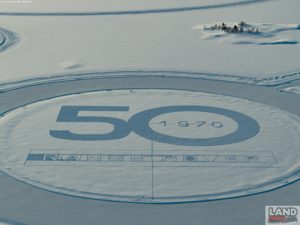 C’est le célèbre artiste Simon Beck, spécialisé dans les œuvres sur neige, qui a créé le logo de l’anniversaire de 53 092 m², en parcourant plus de 45 000 pas à travers la surface poudreuse à l’intérieur du circuit, accompagné d’un quatuor de la gamme Range Rover SV. Un travail qui rappelle bien entendu celui réalisé sur la plage anglaise d’Anglesey en 2015 pour célébrer le Defender, mais aussi la silhouette du nouveau Defender dessinée en 2018 dans la neige des Alpes françaises.