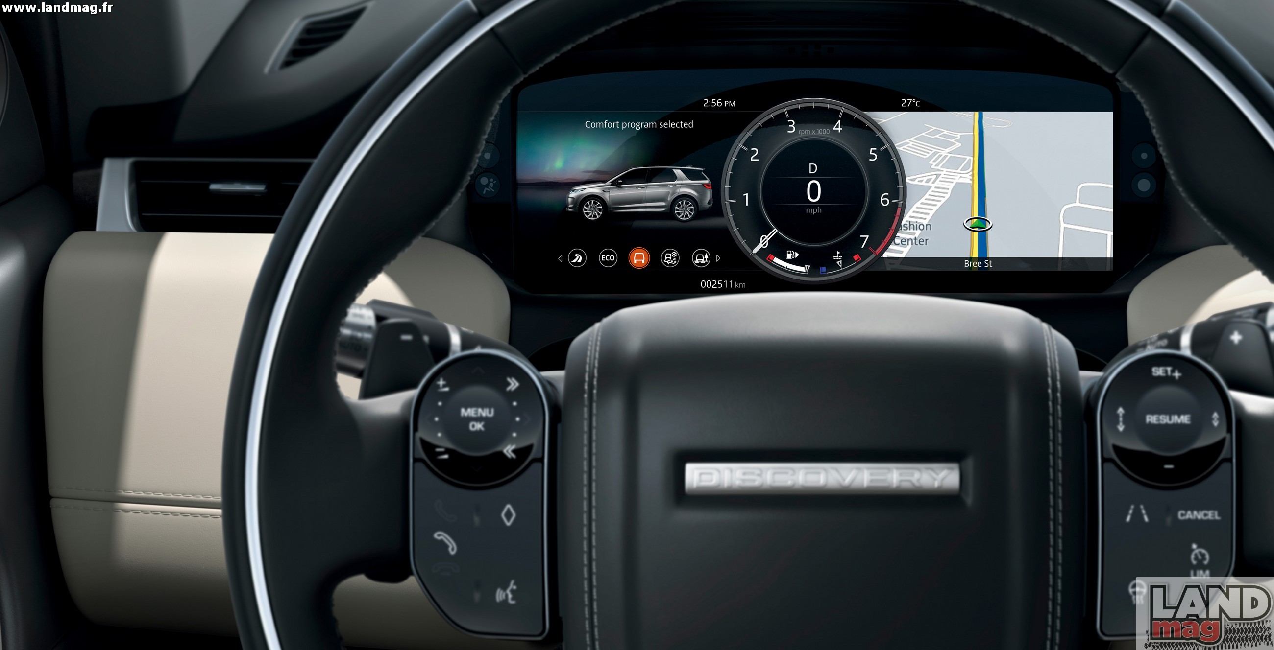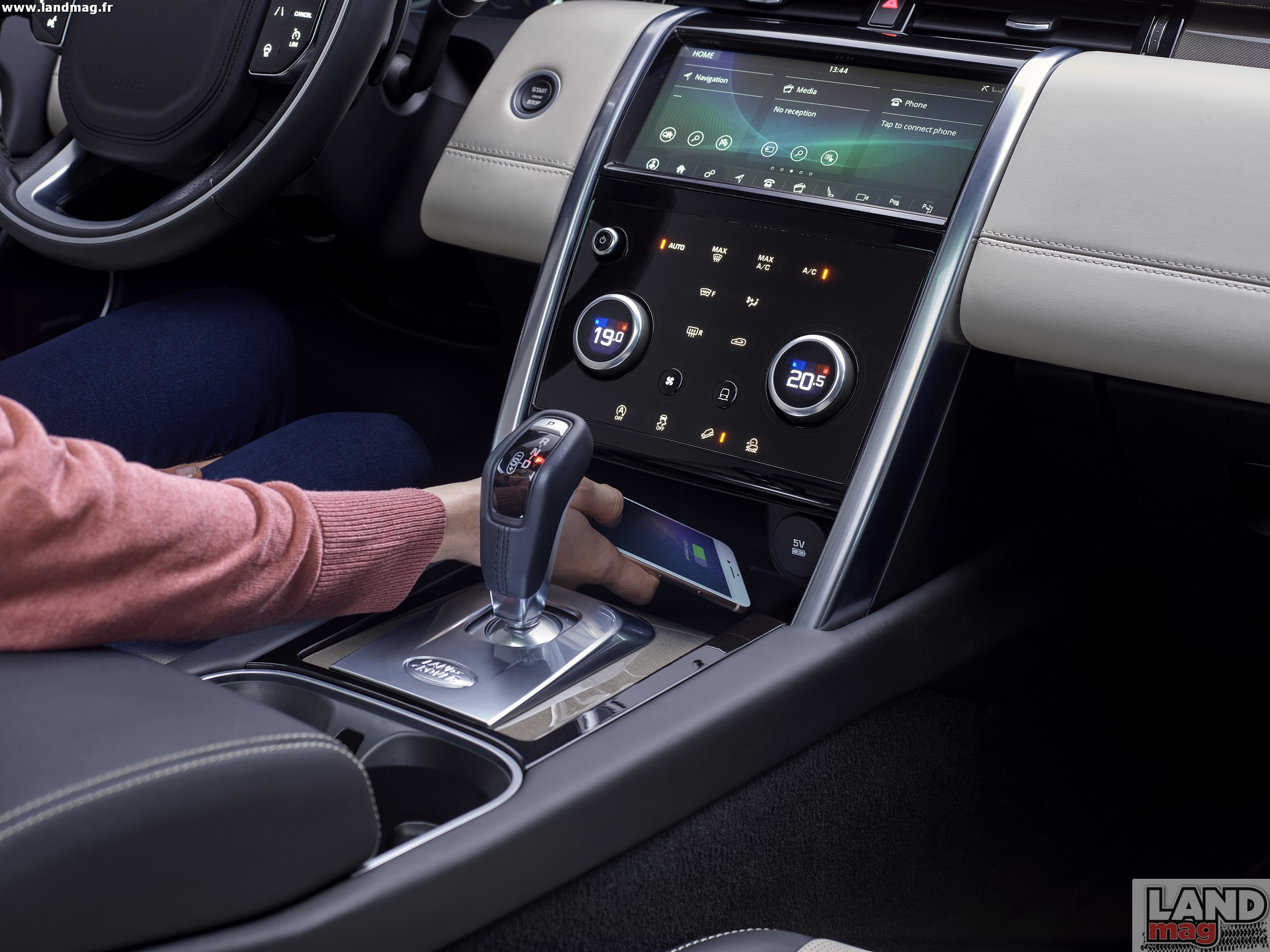 À l’intérieur, la planche de bord évolue fortement au niveau de la console centrale avec un tout nouvel arrangement. Mais attention: si l’Evoque a reçu un système à double écrans tactiles comme le Range Velar, le Discovery Sport n’hérite pas d’un système aussi sophistiqué. Il conserve son grand écran tactile supérieur tandis que les commandes de climatisation, Terrain Response et options de confort (sièges, etc) se pilotent désormais à travers une interface tactile certes, mais sans écran… Deux molettes rotatives permettent de jongler entre les menus et options. Une technologue moins haut de gamme que sur le gamme Range Rover, donc, mais qui sera sans doute plus pratique à utiliser au quotidien… Quand au conducteur, il découvre devant lui un nouvel affichage numérique de 12,3 pouces.