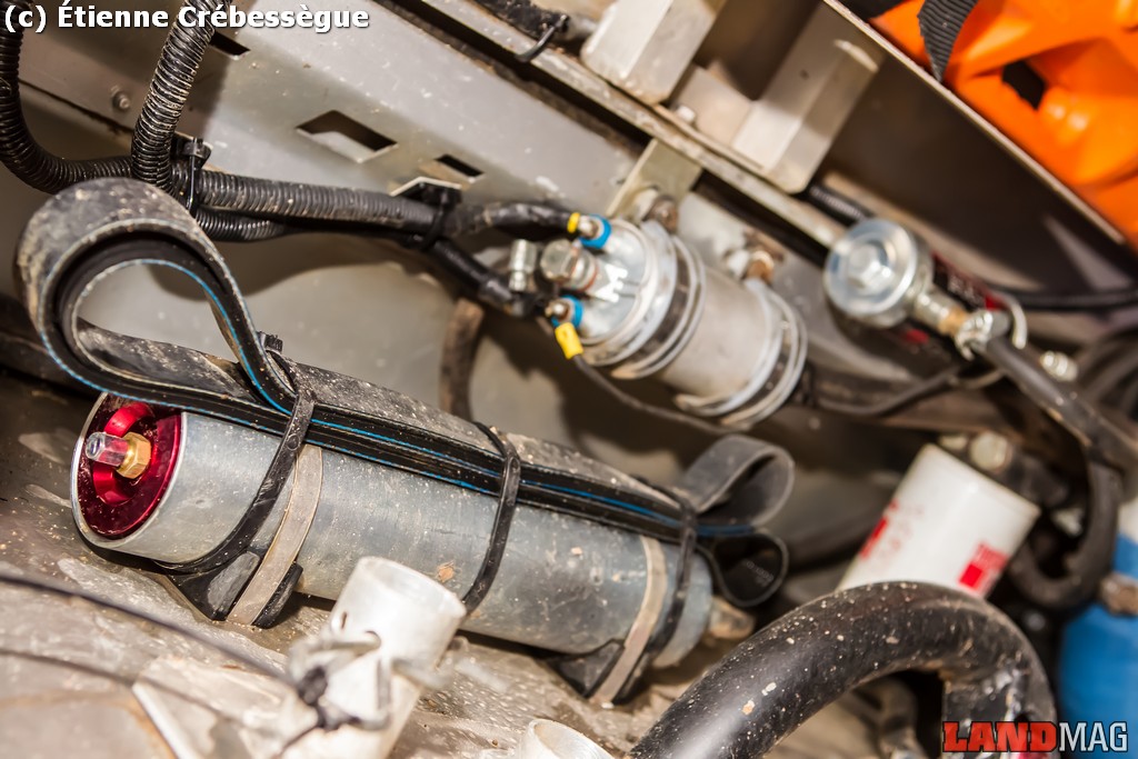 Placé dans la benne, le réservoir en aluminium a été réalisé sur mesure. En soulevant le siège, on remarque que deux batteries Optima rouges ont été installées: une pour l’alimentation électrique du Def et l’autre pour celle du treuil treuil Gigglepin double moteur et free spool. Notez que la recharge est commandée manuellement. Après reprogrammation du calculateur (lui aussi replacé en haut de la benne), le Def prétend développer 205 ch et délivrer 480 Nm de couple. Avec une telle puissance, les Durit ont bien évidemment été remplacées par des modèles en silicone.