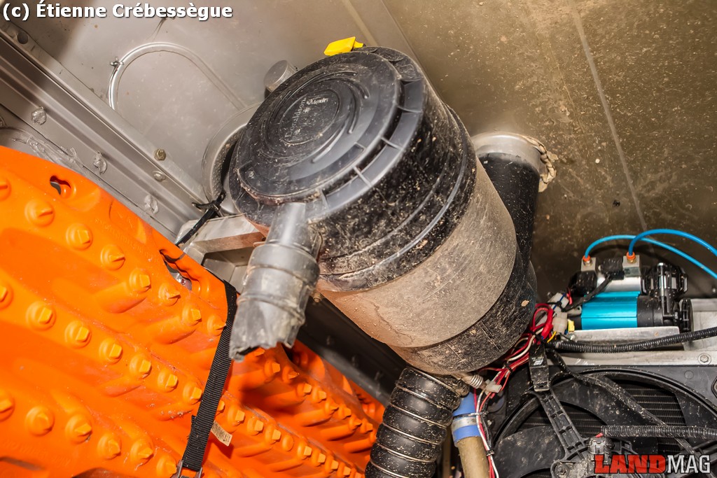 Avec 205 ch et 480 Nm de couple, il fallait trouver une admission à la hauteur. Celle d’origine ne suffisait pas, comme la majorité des kits schnorkels. Franck a alors eu l’idée d’installer un modèle de camion, plus à même à supporter le couple. Restait à résoudre un autre problème : où placer la boîte à air et son filtre pour qu’elle résiste aux traversées de rivières profondes ? Après de longues réflexions, il a alors été décidé de la positionner en hauteur dans la benne et de la brancher à une écope située sur le toit.