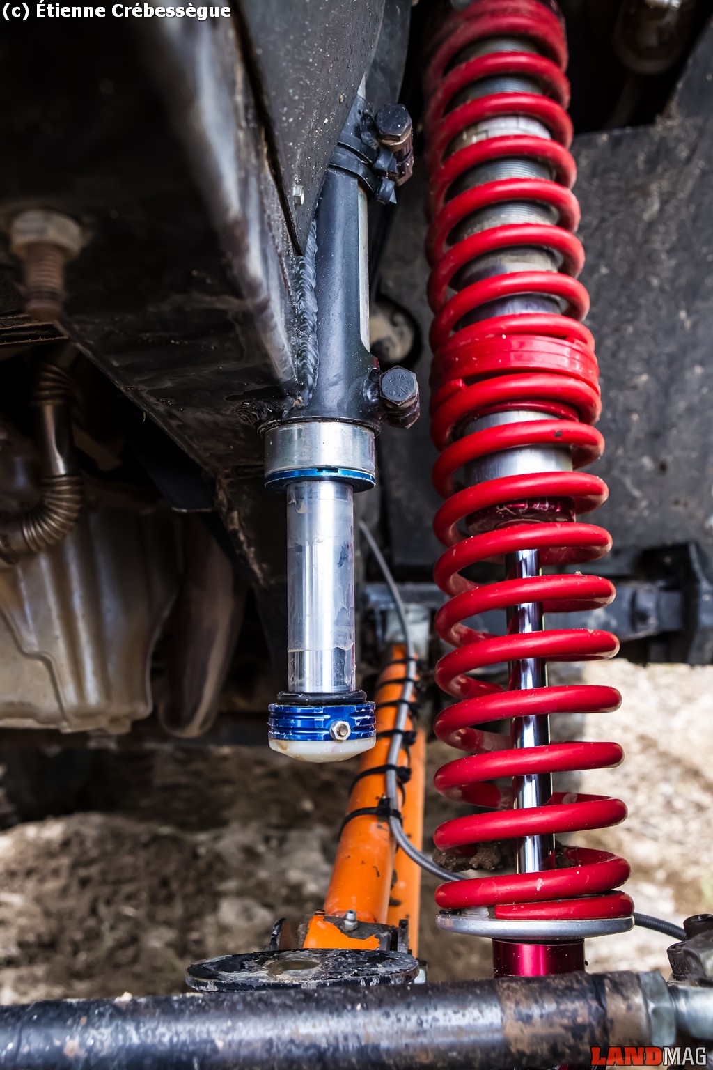 Franck a tenu à ce que les arceaux soient démontables pour accéder au besoin à des parties mécaniques. Les bas de caisse ont eux aussi été fabriqués maison et permettent de repousser les pierres et autres obstacles tout en facilitant la montée à bord. Au rayon accessoires, on note une ancre terrestre X Eng, un ski de protection sur mesure pour protéger les boîtes et un nouvel éclairage ultra puissant LED HP Light. Dans l’habitacle, on fait dans l’efficace. Les baquets Raptor 4×4 by Sparco se chargent de maintenir fermement les occupants. Au milieu, le tunnel de boîte a été créé par la société Inovacier à Dijon. Les commandes du compresseur sont toutes disposées en façade et le Tripmaster Terratrip – 202 plus V4 est solidement fixé pour se repérer facilement.