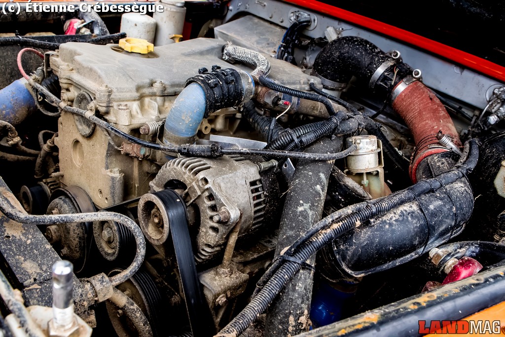 Le seul impératif était de le rendre opérationnel pour le Croatia Trophy 2014. L’équipe a donc travaillé sur 5 points: donner plus de puissance et de couple au moteur, rallonger l’empattement, protéger et renforcer la caisse, transformer la carrosserie et aménager la benne arrière. Pour franchir les obstacles les plus difficiles, il était donc important que le 5 cylindres en ligne délivre le meilleur de lui-même. D’emblée, le turbo a été remplacé par un modèle Turbonetic à géométrie variable éprouvé. Une pompe Facet a alimenté un réservoir tampon et une pompe Bosch est venue remplir efficacement la pompe d’injection. Un Intercooler gros volume plus efficient a remplacé le modèle d’origine tandis que l’admission d’air se fait désormais par une écope maison disposée sur le toit.