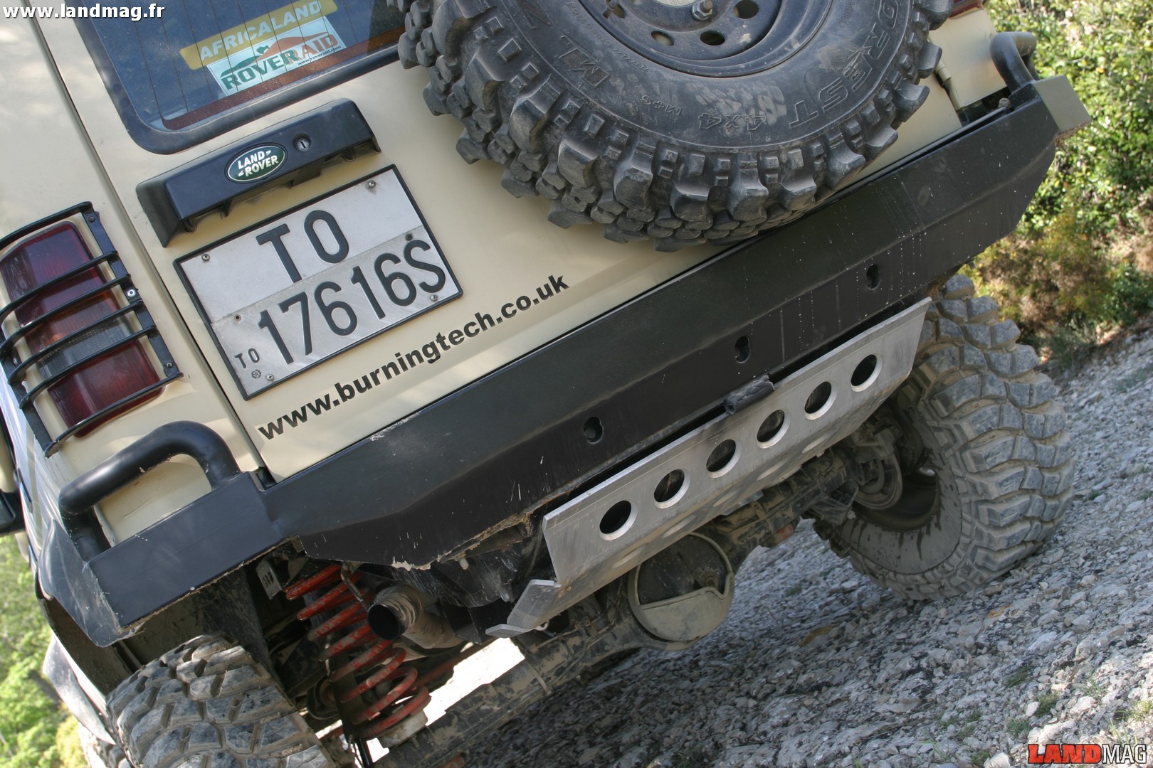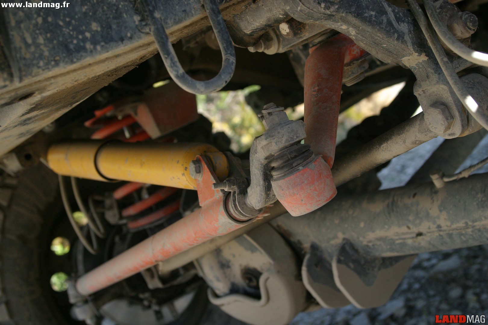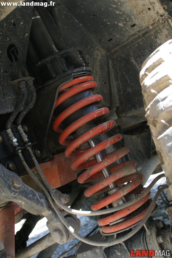 Des demi-arbres de roue de Defender V8 ainsi qu’un pont signé Equipe 4×4 sont installés à l’arrière. Il travaille ensuite sur la direction en installant une barre renforcée Equipe 4×4, ainsi qu’un amortisseur de direction Old Man. La rehausse du Discovery passe par des cales de rehausse Body Lift +3 cm, 4 ressorts extrêmes Equipe 4×4 +5 cm dont les deux arrière recouverts de Teflon pour une meilleure résistance à la corrosion, et des amortisseurs Oram en aluminium à la course plus importante de 3 cm, ainsi que des cônes anti-déboîtement Equipe 4×4. Le Teflon a aussi pour particularité de rendre les deux ressorts arrière plus dur, ce qui permet de corriger l’assiette du Disco qui est plus bas de l’arrière dès qu’il est chargé.