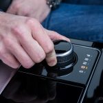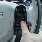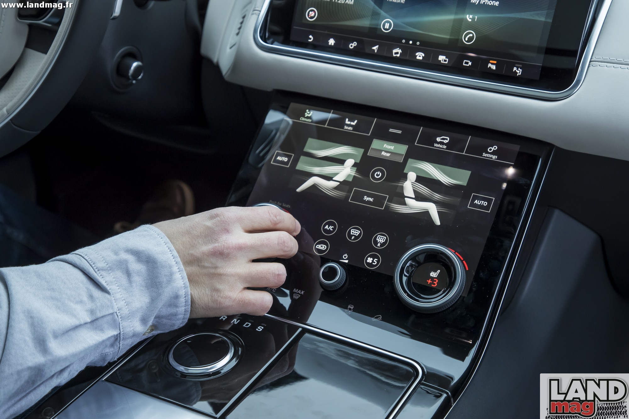 Il faudra prendre place à bord pour voir si d’autres caractéristiques propres aux Range Rover (hauteur d’assise, place à bord) ont elles aussi été respectées ou si, là aussi, le Velar change la donne. Les photos de son habitacle surprennent plus que celles de son extérieur : si on retrouve là aussi pas mal de traits communs avec ses grand-frères (ligne horizontale qui parcours la planche de bord, console centrale large et imposante, cuir partout, volant multifonctions, …) il innove franchement avec une dotation technologique totalement nouvelle ! Le nouveau système Touch Pro Duo comprend en effet deux écrans tactiles haute définition de 10″ : celui du haut, déjà présent sur les modèles actuels, pivote afin d’être plus facilement accessible, et celui du bas permet de piloter les équipements de confort: climatisation, sièges, options d’ambiance à bord… Il prend l’aspect d’une tablette et apporte réellement du nouveau en terme de design mais aussi d’interface pour les passagers.