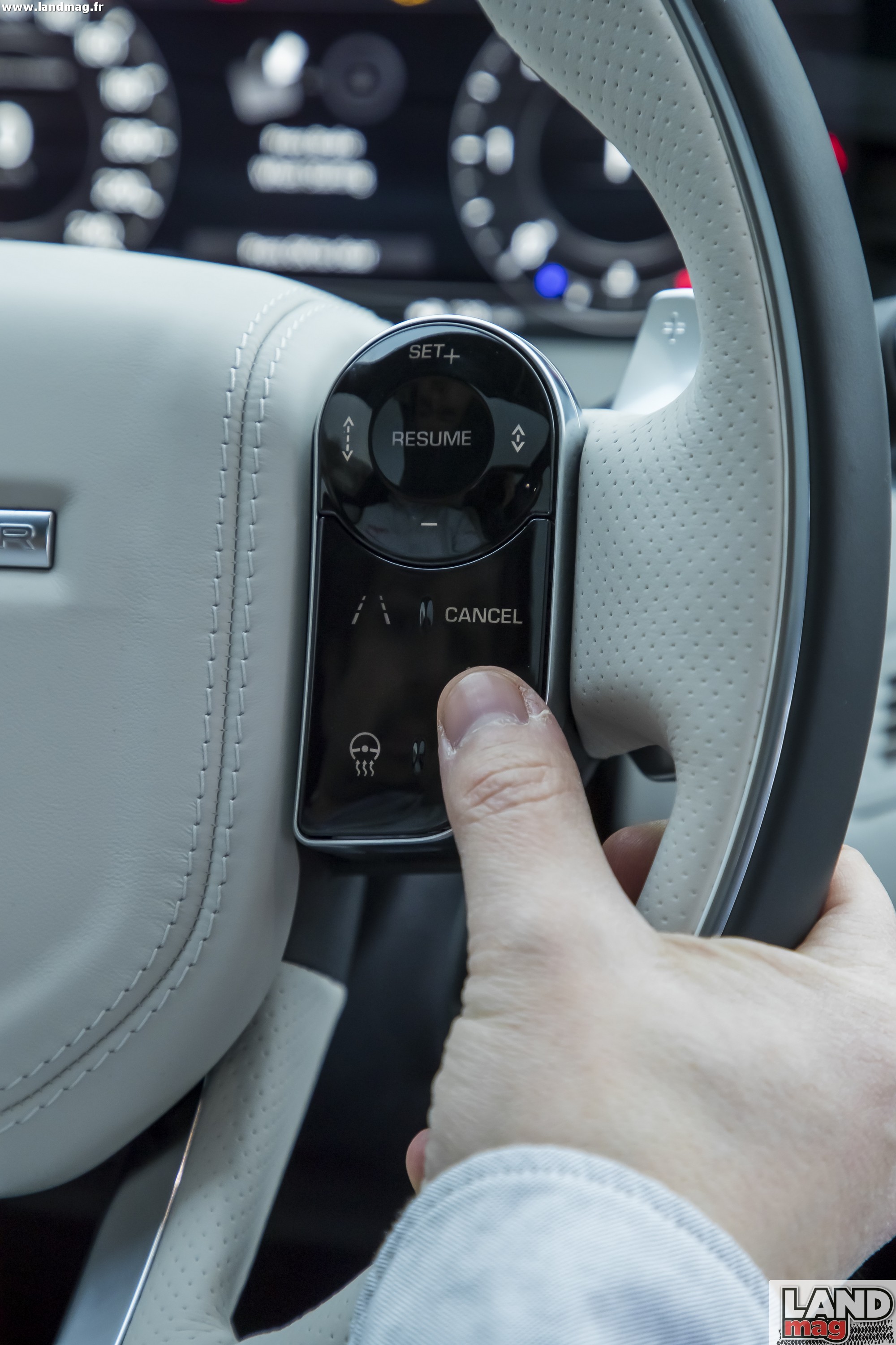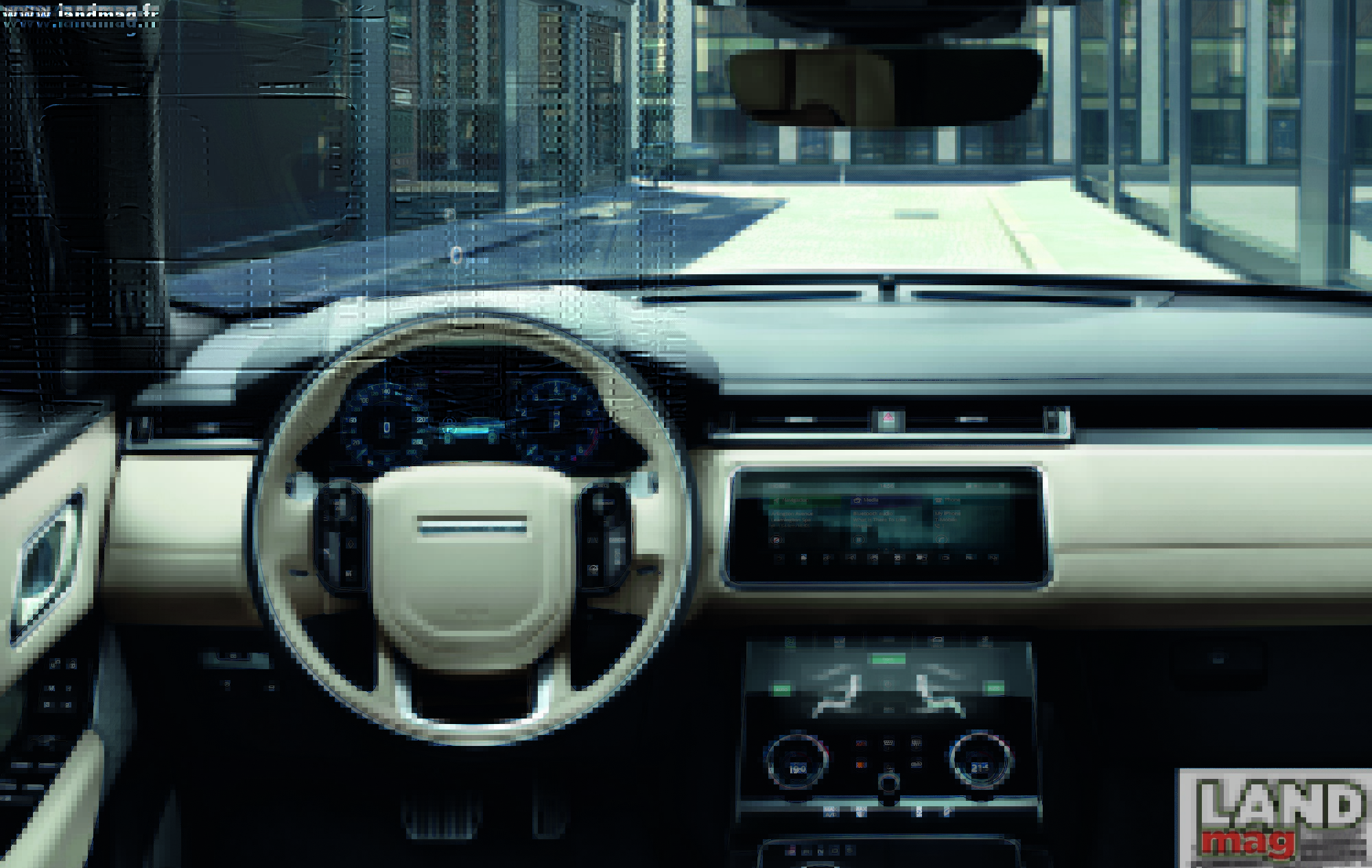 Il faudra prendre place à bord pour voir si d’autres caractéristiques propres aux Range Rover (hauteur d’assise, place à bord) ont elles aussi été respectées ou si, là aussi, le Velar change la donne. Les photos de son habitacle surprennent plus que celles de son extérieur : si on retrouve là aussi pas mal de traits communs avec ses grand-frères (ligne horizontale qui parcours la planche de bord, console centrale large et imposante, cuir partout, volant multifonctions, …) il innove franchement avec une dotation technologique totalement nouvelle ! Le nouveau système Touch Pro Duo comprend en effet deux écrans tactiles haute définition de 10″ : celui du haut, déjà présent sur les modèles actuels, pivote afin d’être plus facilement accessible, et celui du bas permet de piloter les équipements de confort: climatisation, sièges, options d’ambiance à bord… Il prend l’aspect d’une tablette et apporte réellement du nouveau en terme de design mais aussi d’interface pour les passagers.