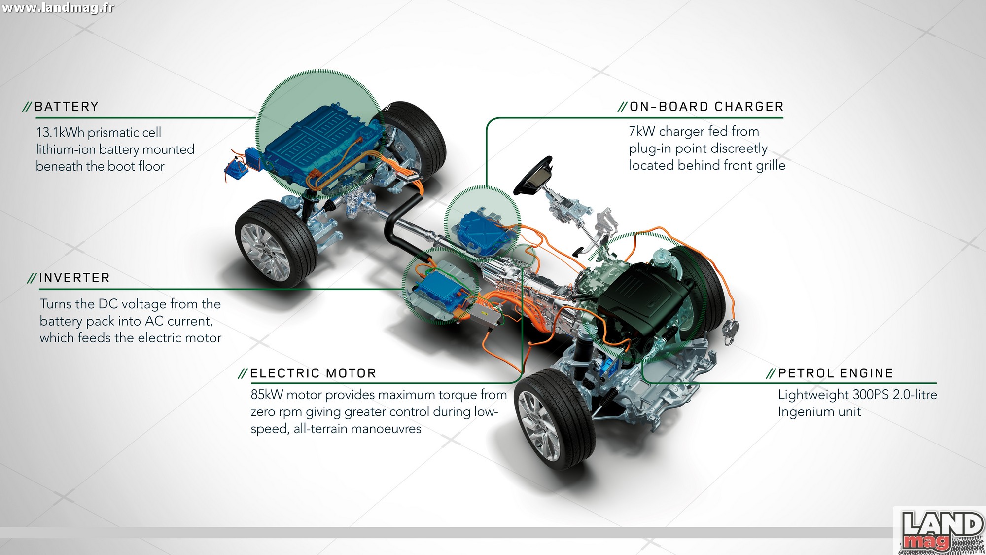 Élément important du dispositif : la batterie. Land Rover a choisi une batterie de 13,1 kWh au Lithium-Ion, qui prend place au milieu du châssis à l’arrière du véhicule et ne modifie donc pas la contenance du coffre. Le moteur électrique est lui accolé à la boîte de vitesse. Enfin le câble de recharge se trouve au niveau de la calandre.