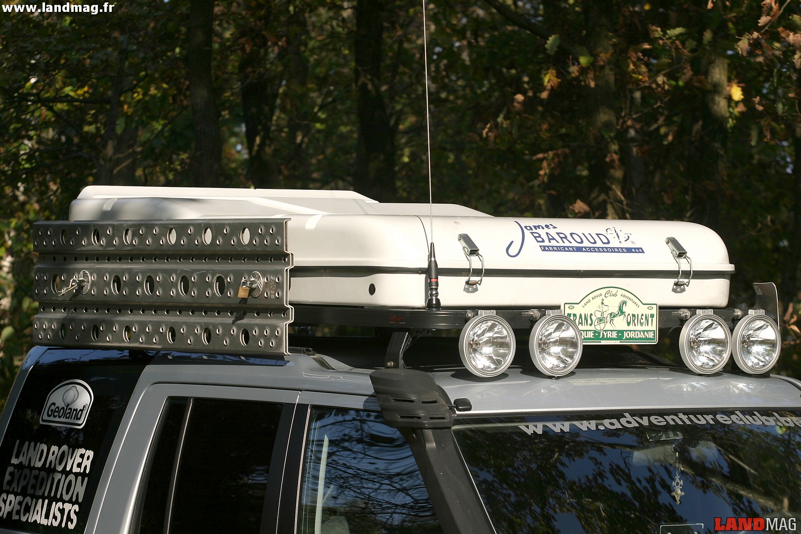 Il n’est pas rare que les Land soient équipés d’un système d’éclairage supplémentaire. Certes esthétique, ce système complémentaire est surtout installé pour la pratique du tout terrain de nuit, lorsque les phares d’origine ne suffisent pas. Deux types d’installations sont les plus récurrents : les phares installés sur le pare-choc avant, devant le radiateur, et la traditionnelle rampe d’éclairage sur le toit. Les feux présents sur le pare-chocs auront tendance à être plus exposés en franchissement dans la mesure où, relativement bas, ils sont en première ligne dans les bourbiers par exemple. C’est la raison pour laquelle il vaut mieux les équiper de protections plastiques que l’on ôte uniquement lorsqu’on s’en sert. La traditionnelle rampe de phare a toujours autant d’adeptes qui peuvent dorénavant installer des feux à longue portée halogènes rond ou rectangulaires, des feux antibrouillard, et des feux de recherche sur la même installation du fait des systèmes électriques plus économiques et de la diminution des tailles des phares. Ce système présente néanmoins comme inconvénient majeur d’être directement exposé aux branches en forêt.